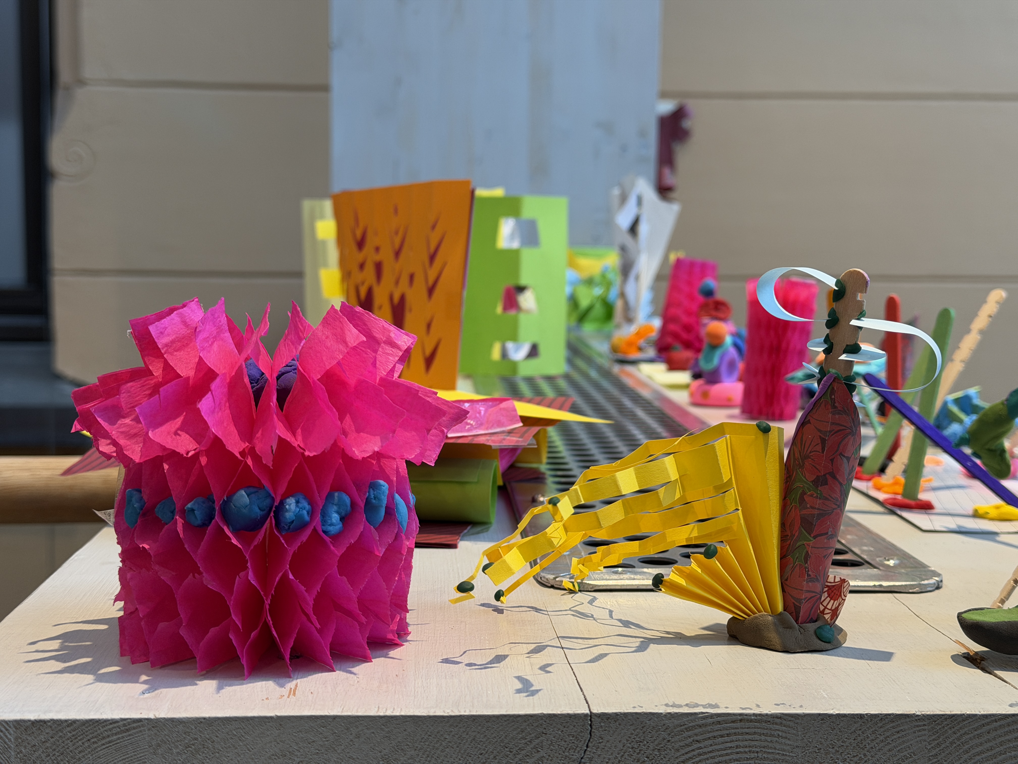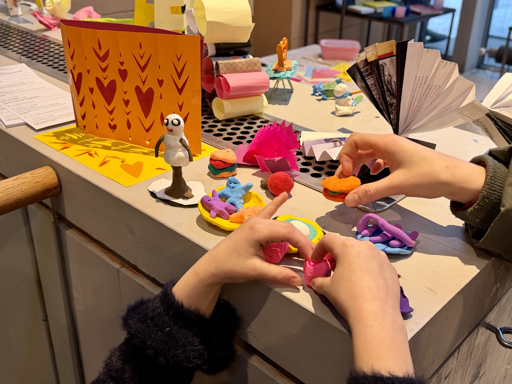 Kunstbanken tilbyr drop-in aktiviteter inspirert av utstillingene som vises. Besøkende kan sette seg ned ved aktivitetsbordet, og skape noe med enkle materialer.